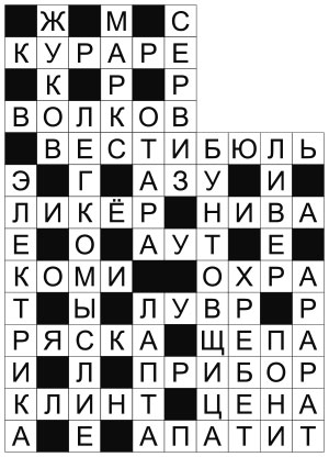 По горизонтали: 5. Псарня. 9. Гражданка. 10. Бистро. 11. Пенсионер. 12. Мутант. 13. Идиот. 14. Бокал. 18. Гобелен. 19. Кашевар. 22. Пиренеи. 23. Жердь. 24. Поле. 26. Дознаватель. 27. Анна. 28. Контрамарка. 29. Абак.