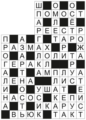По вертикали: 1. Туман. 2. Чистюля. 4. Увар. 5. Иней. 6. Намотка. 7. Разин. 10. Контрабанда. 11. Тотализатор. 14. Цветник. 15. Кисть. 16. Зерно. 17. Аллюр. 18. Уэльс. 23. Трактат. 24. Товарка. 26. Дверь. 27. Гиена. 29. Омар. 30. Наст.
