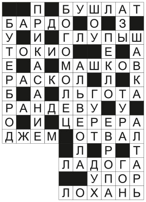 По горизонтали: 1. Чудачество. 9. Тритон. 10. Настроение. 11. Чтение. 12. Ласка. 13. Филе. 15. Слабак. 16. Филателист. 17. Ваучер. 20. Брутто. 23. Аорта. 24. Тальк. 27. Лакомка. 28. Рыбка. 29. Мадам. 30. Нянечка. 31. Всход. 32. Дышло. 33. Аксиома.