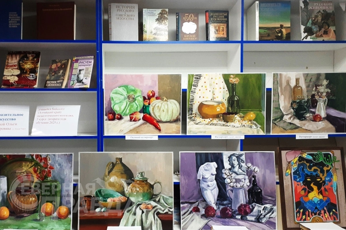 Немалый интерес проявили гости воскресной гостиной к выставке изобразительного искусства Скажутиной Ольги Александровны (пгт Новая Чара), учащейся 3-го курса Бийского педагогического колледжа (Алтайский край), вобравшей в себя занимательные полотна с портретной графикой, натюрмортами, изображениями, выполненными в технике батик. Выставка оформлена в читальном зале библиотеки и каждый посетитель может с ней познакомиться.