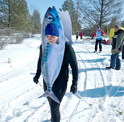 Отдельного внимания заслуживает самая яркая участница забега Ксения Баканова. На лыжню Ксения вышла в необычном костюме скумбрии. «Весёлая рыбка» не только подняла настроение всем присутствующим, но и доказала, что креатив спорту не помеха, став первой в своей возрастной категории.